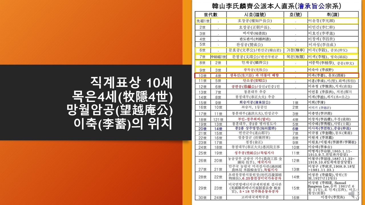 한산이씨 14세로 호장공 이윤경 선조님의 13대손이자 중시조 한산부원군(韓山府院君) 문정공(文靖公) 목은(牧隱) 이색(李穡, 1328~1396) 선생의 목은7대손, 묵은8세(牧隱8世) 통훈대부(通訓大夫) 이계(李洎) 선조에 대해서 알아보도록 하겠습니다. . 이계(李洎) 선조님은 고려말 대학자 문정공 목은 이색 선조님의 7대손이고 진현관 제학을 지낸 인재공 이종학 선조님의 6대손이고 광주목사를 지낸 광목공 이숙야 선조님의 5대손이고 황해도 관찰사를 지낸 망월암공 이축 선조님의 고손자로 한산이씨 권지호장공계 14세로 호장공 이윤경 시조님의 13대손입니다. . 좌승지 이회 (李澮) 어른, 좌승지 겸 1등공신 이덕기 어른, 그리고 안성군수 이충연 (李沖淵) 어른이 아들.손자.증손자입니다. . 충좌위(忠佐衛) 호..